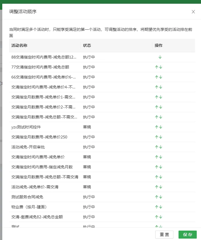 当同时满足多个活动时,只能享受满足的第一个活动,可调整活动的排序,将期望优先享受的活动排在前面