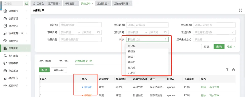 PC端列表增加“创建人”列,数据为原运送下单操作人;原“下单人”调整为科室人员,需显示所属科室;历史数据不调整;增加下单渠道展示,包括PC端、物业APP、医院端小程序